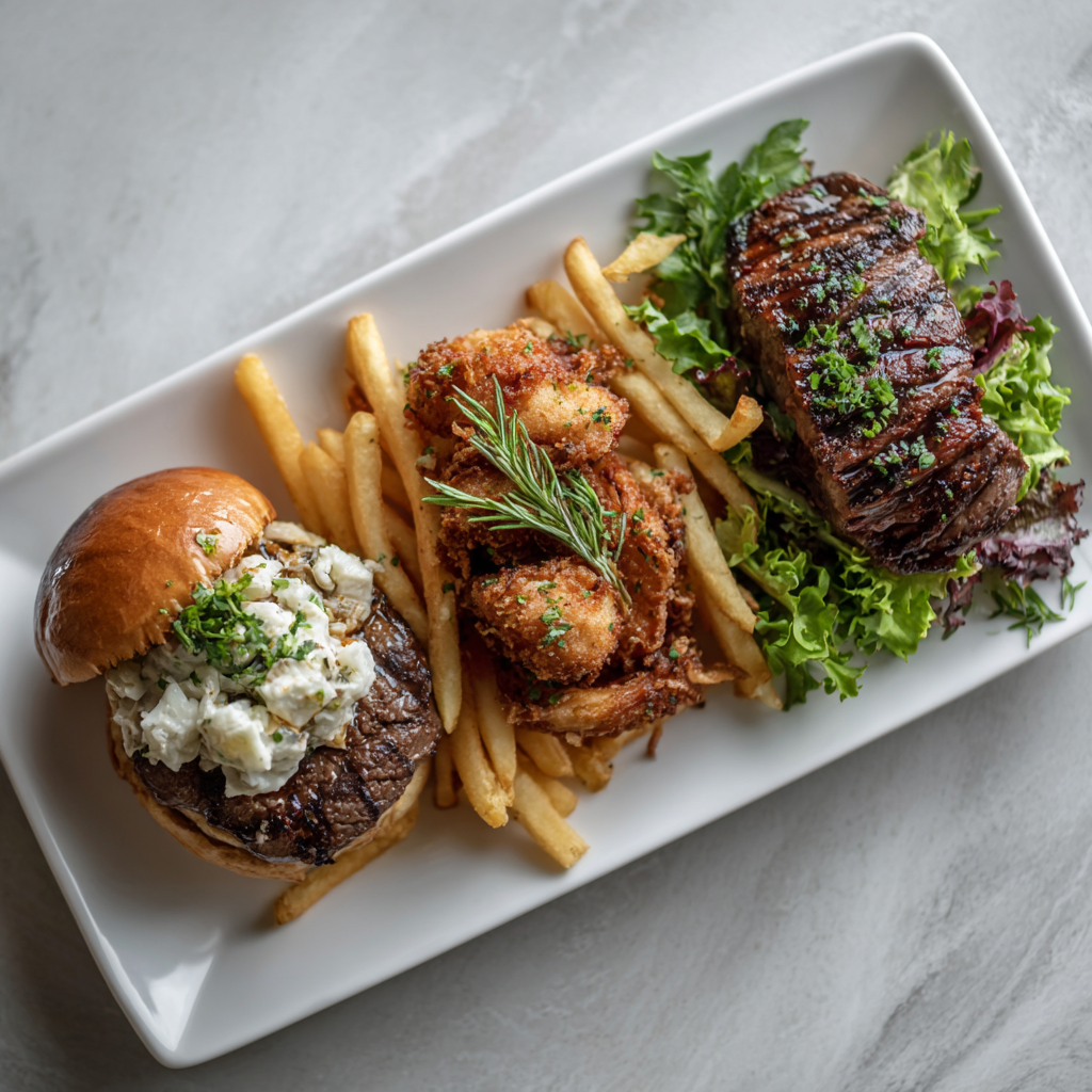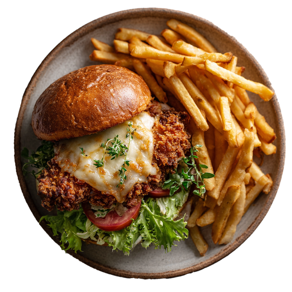 Profitez de nos burgers généreux au bœuf ou au poulet pané croustillant, ou laissez-vous tenter par une tendre pièce du boucher.
