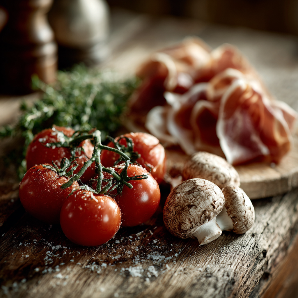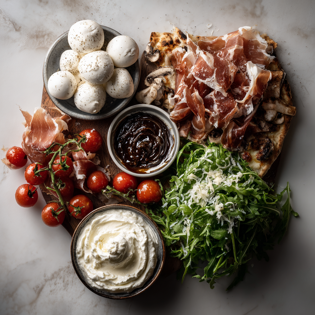 17,50 / 20,50 €Crème fraîche, mozzarella ,champignons de Paris, jambon de Parme, tomates cerises, crème de truffe, salade en fin de cuisson, crème balsamique