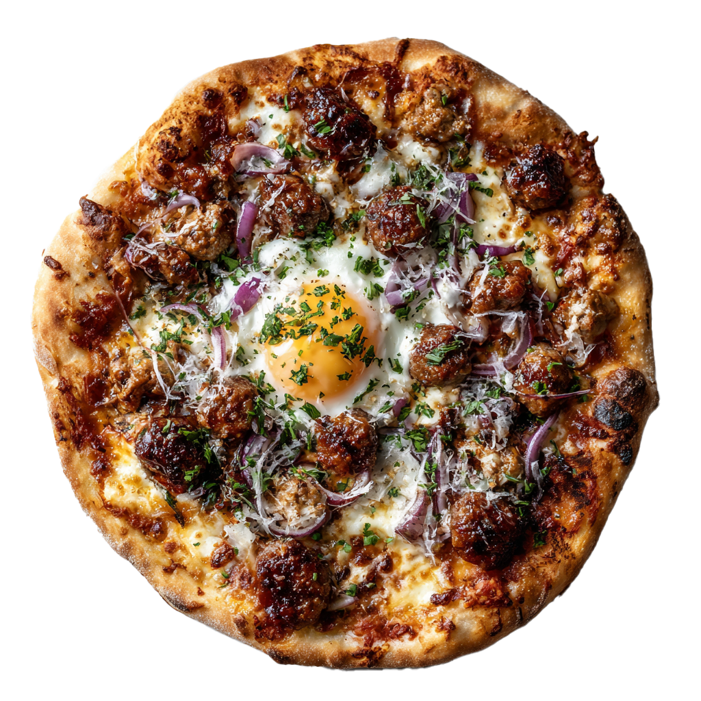 13,50 / 16,50 €Tomate, bœuf haché, bacon, oignons, cheddar, œuf, mozzarella